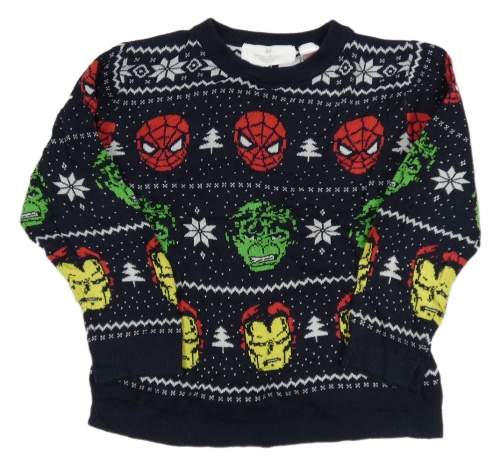 Tmavomodrý svetr se superhrdiny a norský vzorem H&M