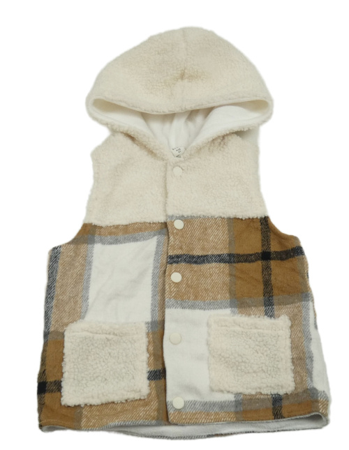 Smetanovo-hnědo-černá kostkovaná huňato/flaušová vesta s kapucí Shein