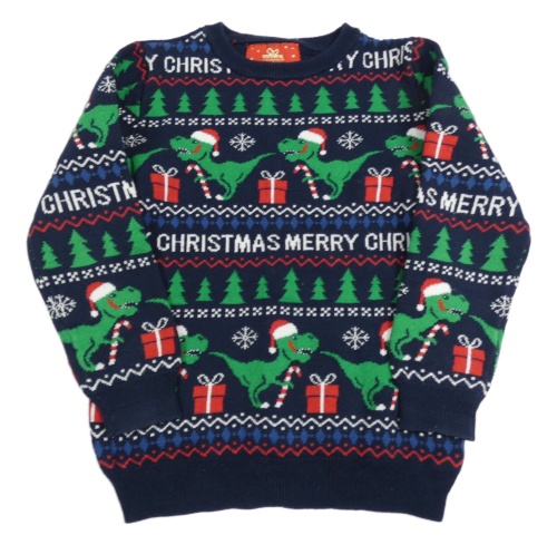 Tmavomodrý svetr s dinosaury s vánočním motivem a stromečky a dárky PRIMARK