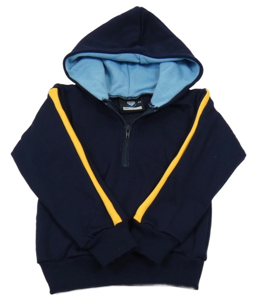 Tmavomodrá mikina se žlutým pruhem a kapucí