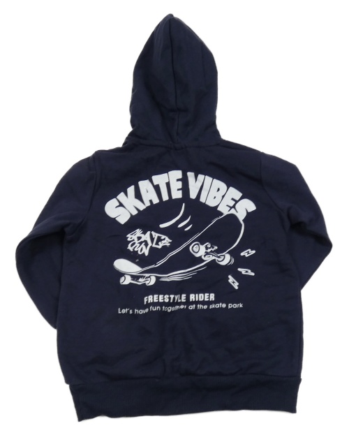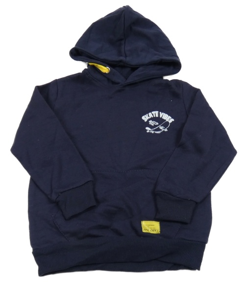 Tmavomodrá mikina se skateboardem a nápisem a kapsou a kapucí TESSENTIALS
