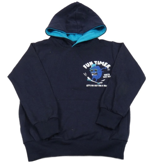 Tmavomodrá mikina s příšerkou a nápisy a kapsou a kapucí TESSENTIALS