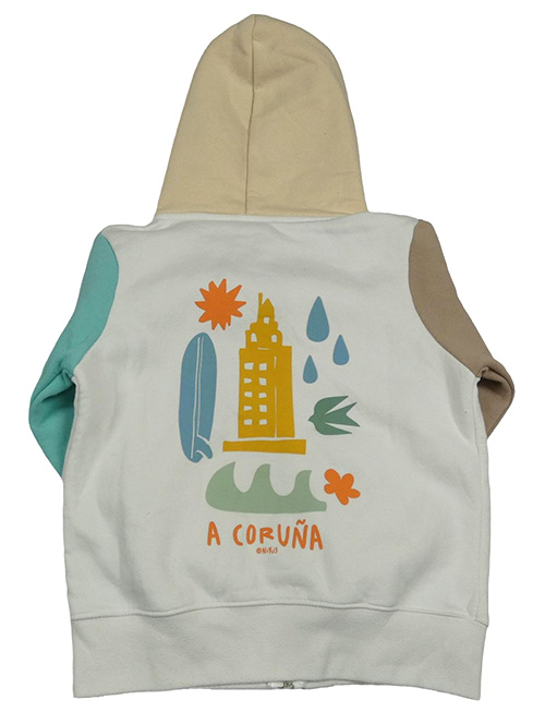 Bílo-tyrkysovo-hnědá propínací mikina s potiskem a kapucí
