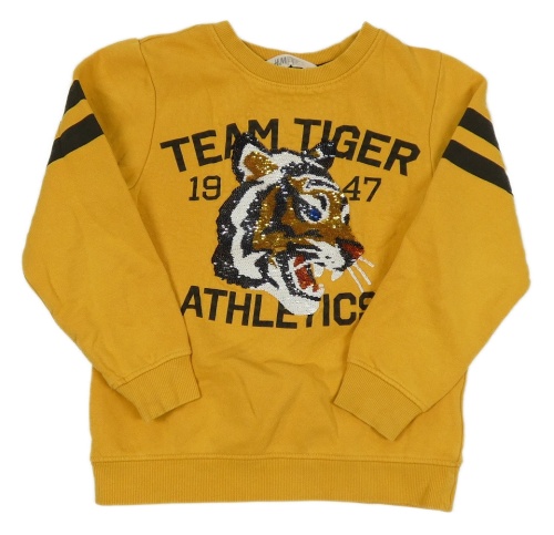 Hořčicová mikina s tygrem z flitrů a nápisy a číslem a pruhy H&M