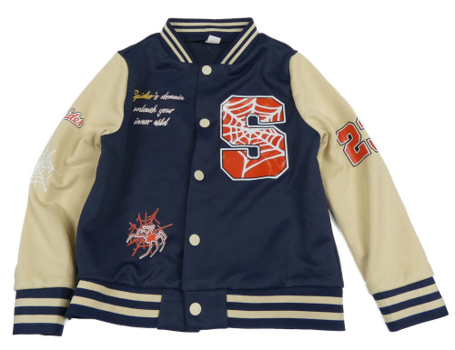 Tmavomodro-béžová baseballová mikina s písmenkem a pavoukem a číslsem a pruhy