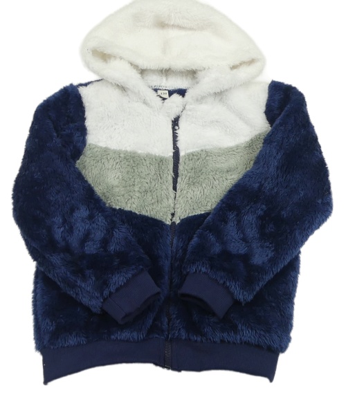 Bílo-šedo-tmavomodrá chlupatá propínací mikina s kapucí