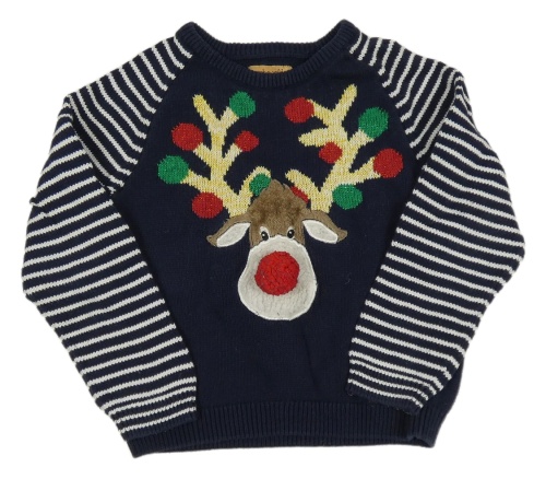 Tmavomodrý svetr s pruhovanými rukávy a sobem