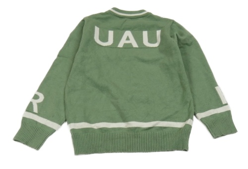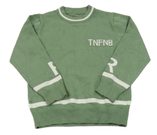 Zelený lehký svetr s bílým pruhem a nápisem