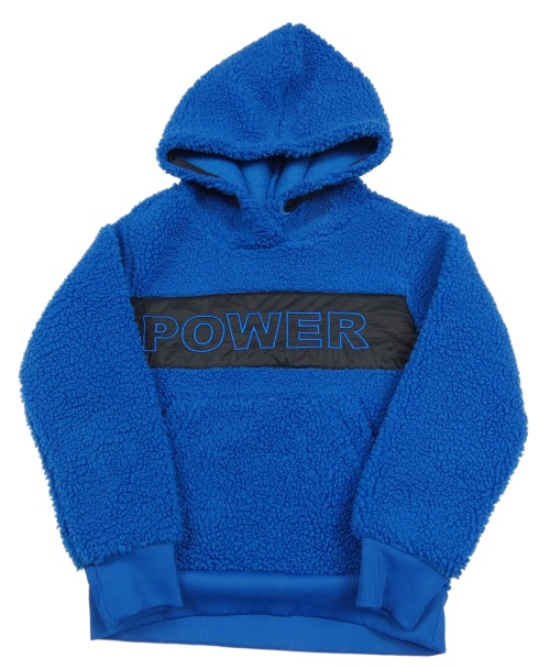 Modro-černá huňatá mikina s nápisem a kapucí