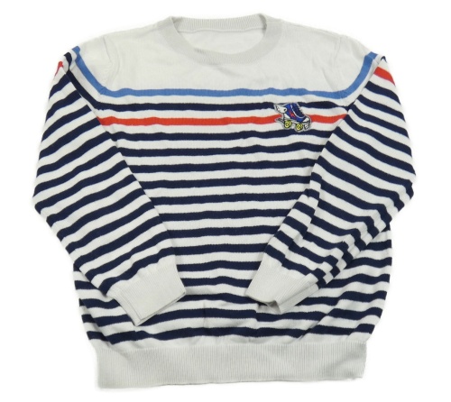 Bílo-tmavomodro-červený svetr s pruhy a nášivkou