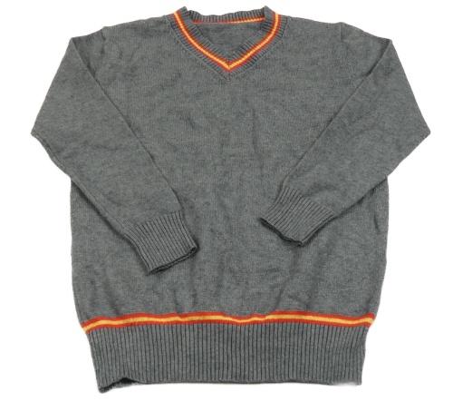 Šedý svetr s červeným lemem