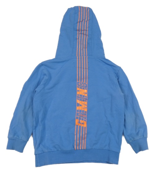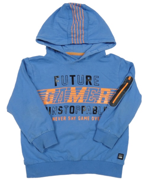 Modrá mikina s oranžovými nápisy a kapucí