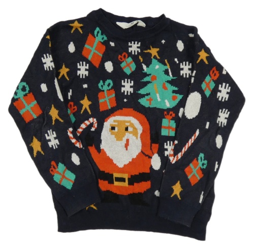 Tmavomodrý vánoční svetr se Santou a stromečkem a dárečky H&M