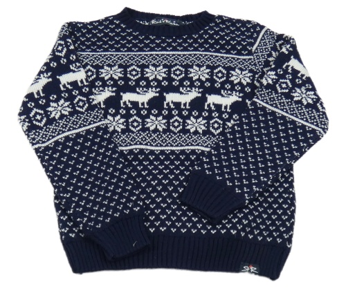 Tmavomodro-bílý svetr se soby a norským vzorem