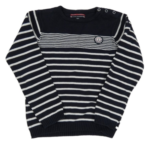 Tmavomodro-bílý pruhovaný svetr s nášivkou