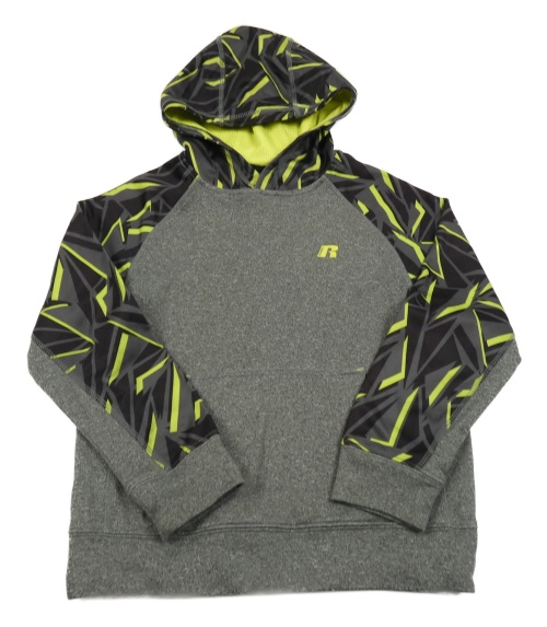 Šedo-černo-neonově zelená thermo mikina se vzorovanými rukávy a kapucí Russel