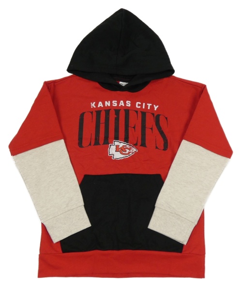 Červeno-černá mikina s nápisem, béžovými rukávy a kapucí