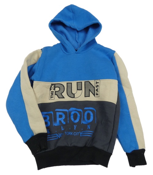 Modro-béžovo-tmavošedá mikina s nápisem a kapucí