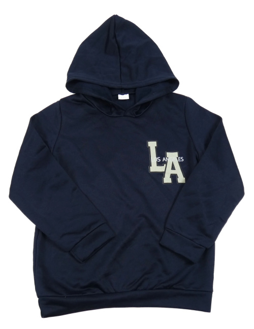 Tmavomodrá mikina s nápisem a kapucí