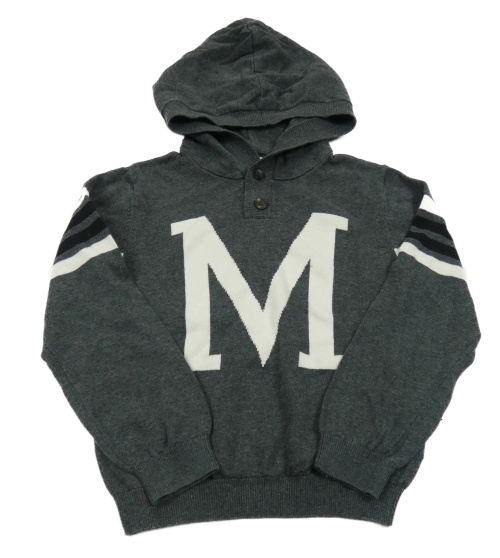 Tmavošedý svetr s písmenem a kapucí