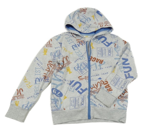 Světlešedo-modrá melírovaná propínací mikina s nápisy a kapucí Kids