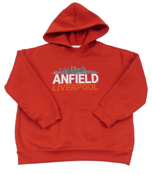 Červená mikina s mrakodrapy a kapucí