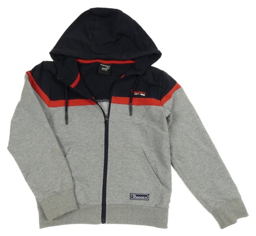 Tmavomodro-červeno-šedá propínací mikina s nápisem a kapucí