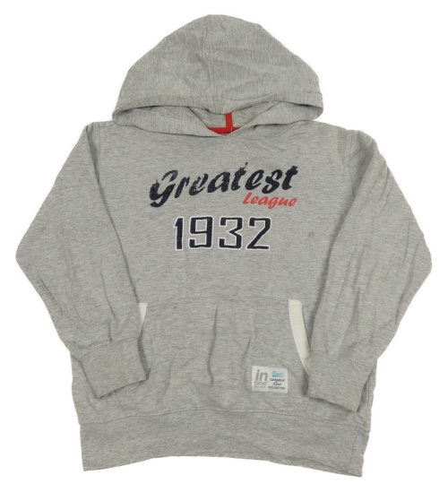 Šedá melírovaná mikina s číslem a nápisy a kapsou a kapucí