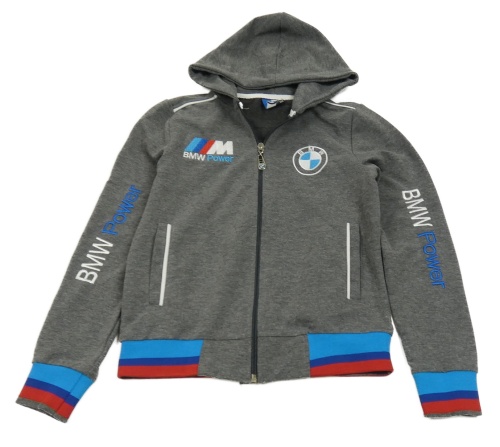 Šedo-modro-červená propínací mikina s výšivkami a kapucí