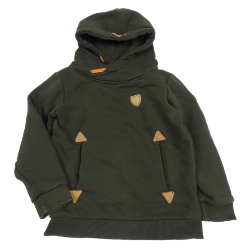 Tmavokhaki mikina s nášivkami a kapucí