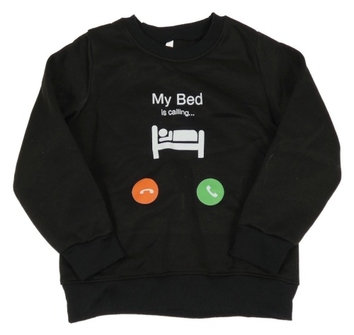 Černá teplá mikina s potiskem postele a tlačítek se sluchátky
