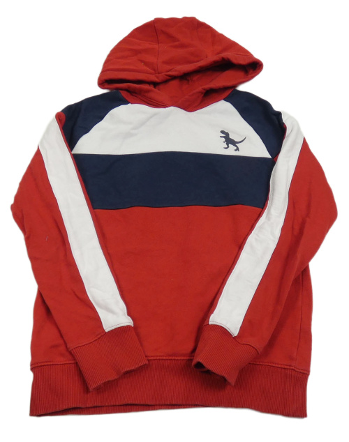 Červeno-bílo-tmavomodrá mikina s dinosaurem a kapucí C&A