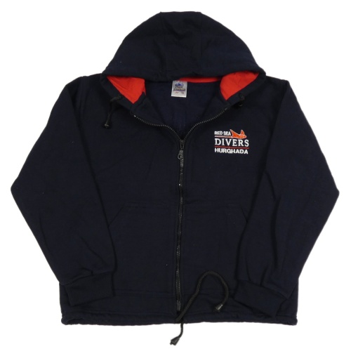 Tmavomodrá propínací teplá mikina s nápisy a letadlem a kapucí