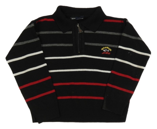 Černo-šedo-červený pruhovaný polo svetr s výšivkou