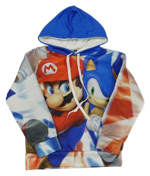 Modro-bílo-červená sportovní mikina s Mariem a Sonicem a kapucí