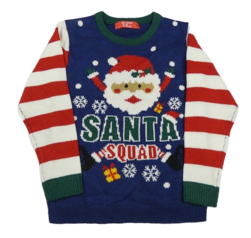 Tmavomodro-červeno-bílý svetr se Santou a pruhy na rukávech