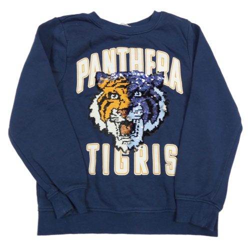 Tmavomodrá mikina s tygrem/panterem z překlápěcích flitrů a nápisy H&M