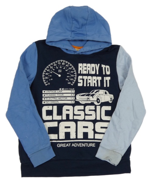 Tmavomodro-modro-světlemodrá mikina s nápisy a autem a kapucí Kids