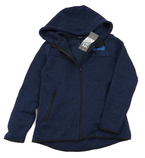 Nové - Tmavomodrá melírovaná pletená propínací mikina s nápisem a kapucí Y.F.K.