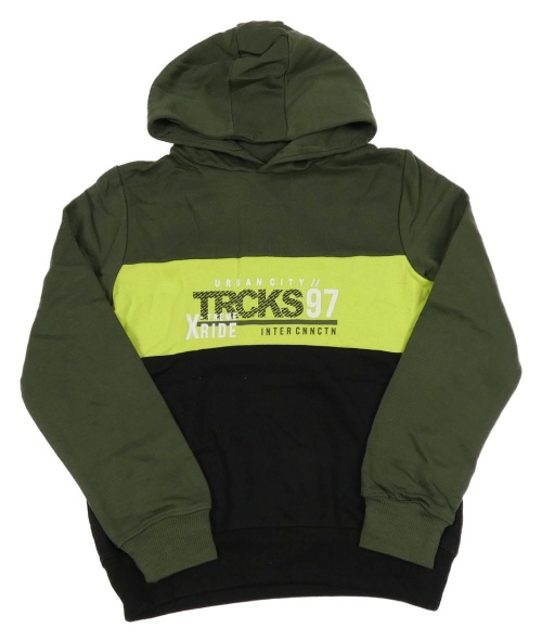Tmavokhaki-limetkovo-černá mikina s nápisy a číslem a kapucí Y.F.K.