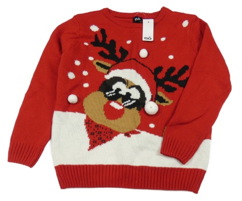 Nové - Červeno-bílý svetr se sobem a 3D bambulemi