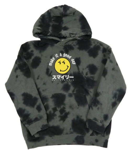 Tmavošedo-černá batikovaná mikina se smajlíkem a nápisy a kapsou a kapucí H&M