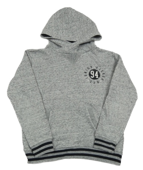 Šedo-černá melírovaná mikina s číslem a nápisy a kapsou a pruhy a kapucí H&M