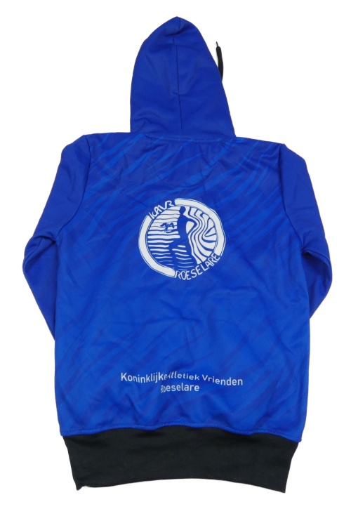 Modrá vzorovaná sportovní mikina s nápisy a kapucí