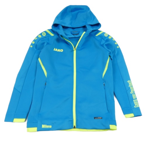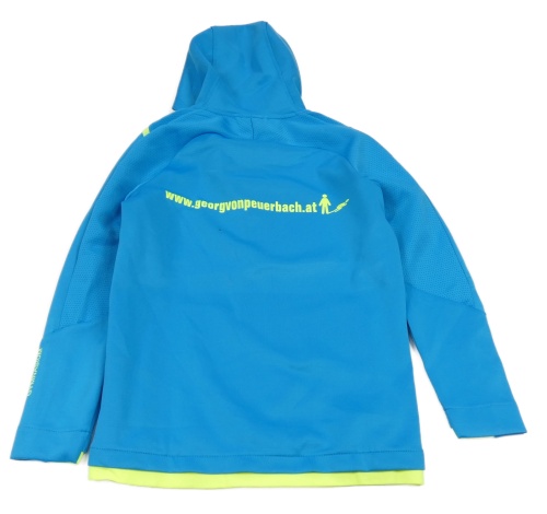 Tyrkysová sportovní funkční propínací mikina s logem a kapucí jako