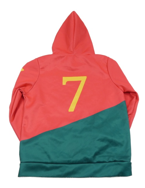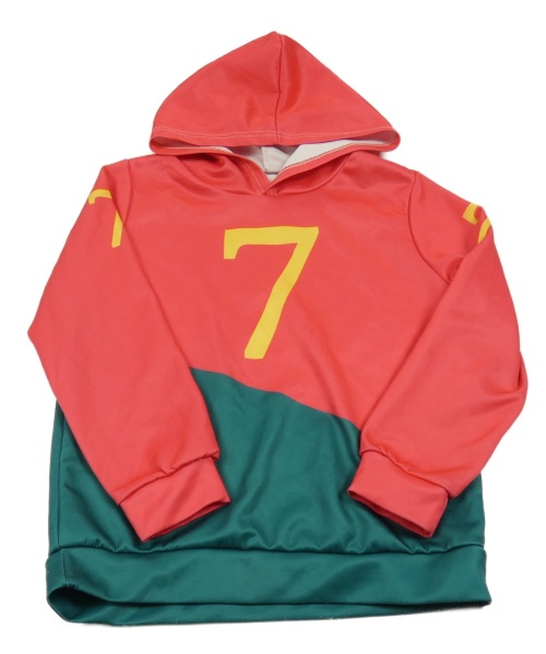 Červeno-zelená mikina s číslem a kapucí
