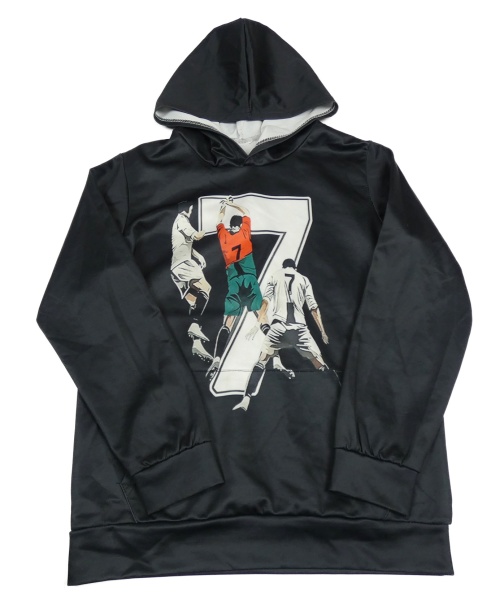 Černá sportovní mikina se sportovci a číslem a kapsou a kapucí