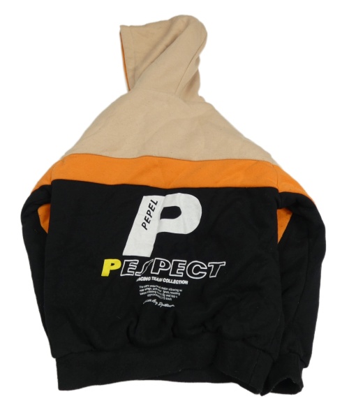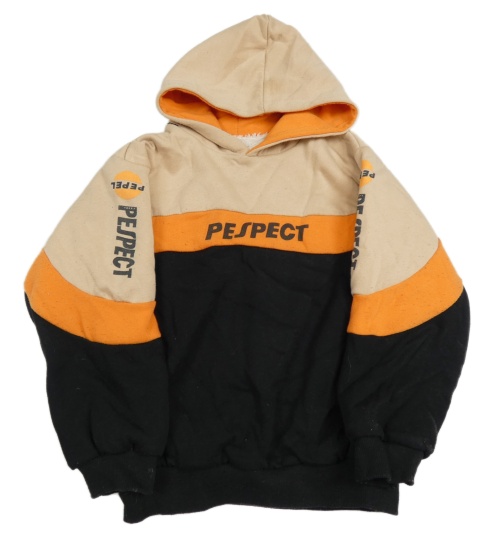 Béžovo-oranžovo-černá zateplená mikina s nápisy a kapucí