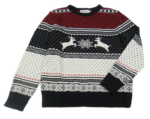 Černo-bílo-červený vzorovaný svetr s jeleny