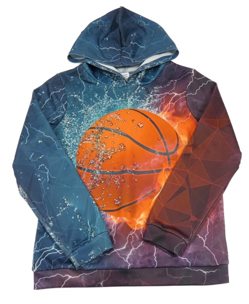 Modro-oranžovo-fialová vzorovaná sportovní mikina s míčem a kapucí